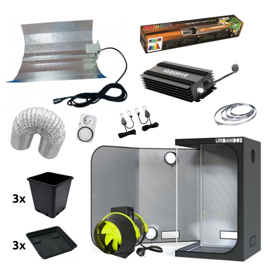 Das Set enthält ein einstellbares Vorschaltgerät, das bei Verwendung einer 250-Watt-Lampe auf 250 Watt eingestellt werden muss.