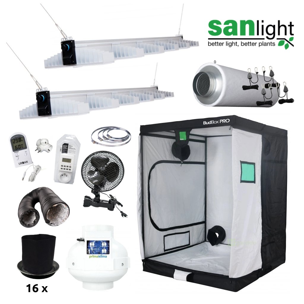 Günstiges Growset mit Technik SANlight EVO 6-150 400W EIS 3 µmol/J - V1.5, für den Anbau in den eigenen vier Wänden mit zwei 400W LED-Lampen. Das Set kann entsprechend Ihren Anforderungen angepasst werden, kontaktieren Sie uns einfach.