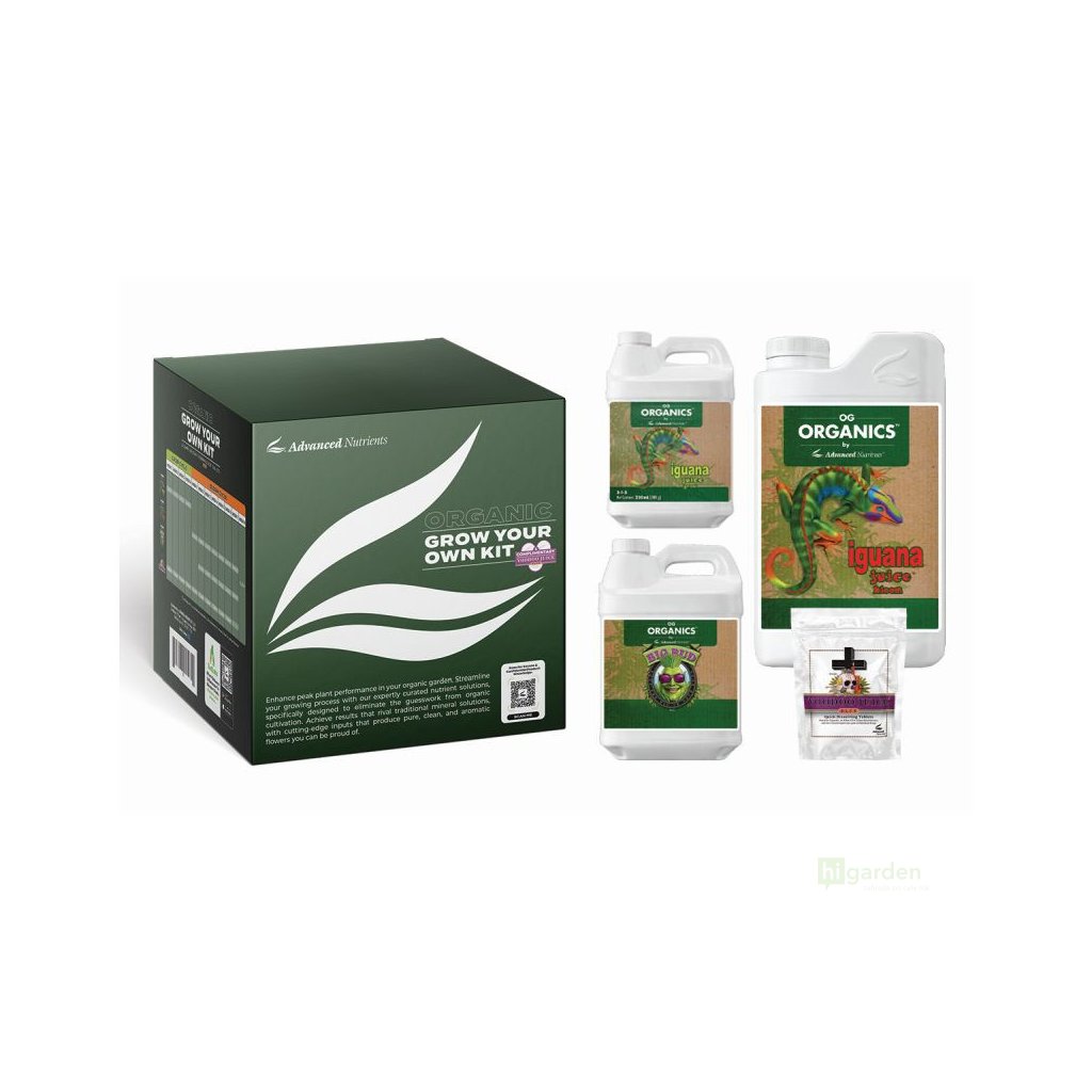 Das Advanced Nutrients Organic Grow Your Own Kit enthält OG Organics™ Iguana Juice® Grow 250 ml & Bloom 1L, OG Organics™ Big Bud® 500 ml und 10 x 0,1 g Voodoo Juice® Plus Tabletten.