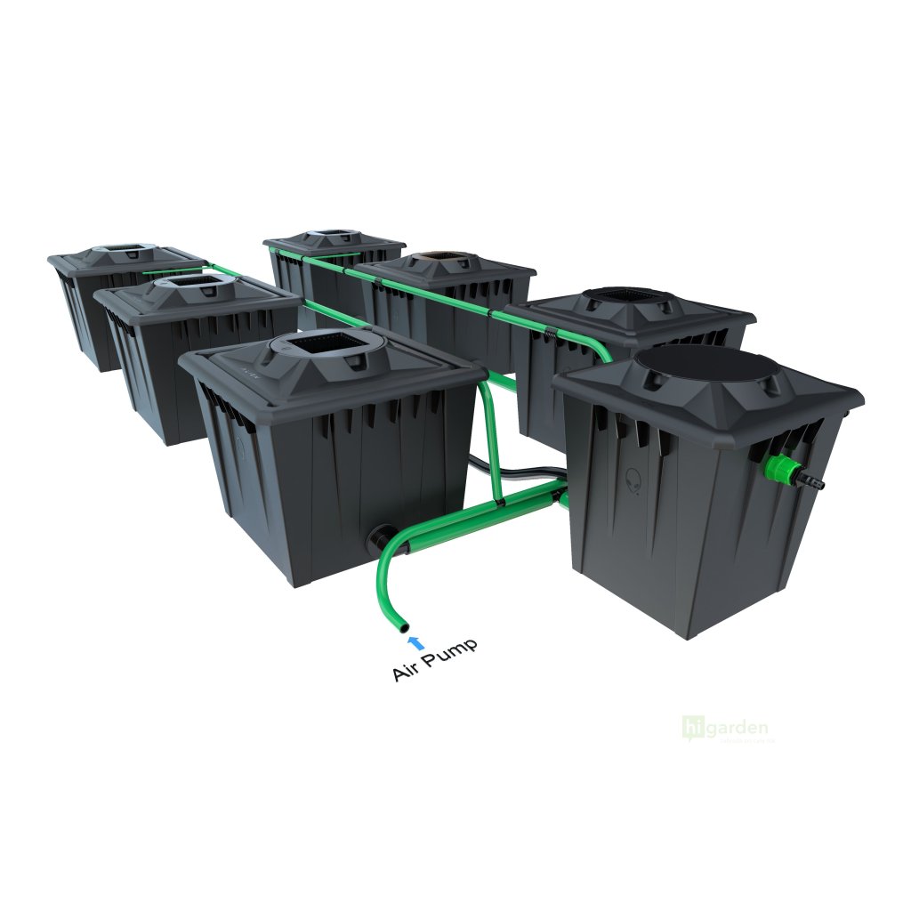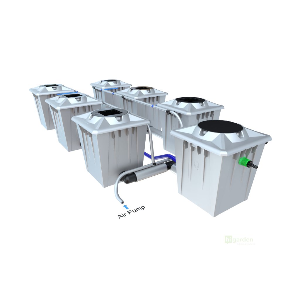 der Alien Hydroponics RDWC 6Pot mit sechs Töpfen ist in Silber und Schwarz erhältlich. Es gibt zwei Topfgrößen zur Auswahl, beide verfügbar in 20L und 36L.