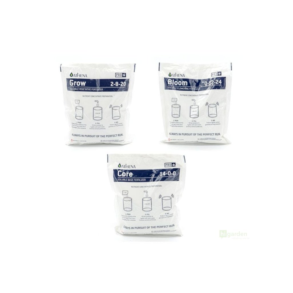 Das Düngerset Athena PRO Line Small enthält 1x Athena PRO Grow 2,2 kg, 1x Athena PRO Bloom 2,2 kg, 1x Athena PRO Core 2,2 kg.