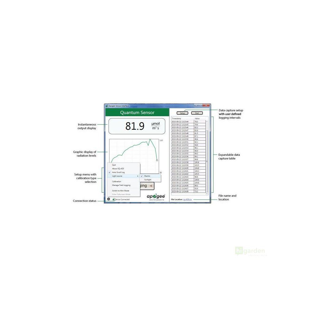 Der SQ-520 kann über ein USB-Kabel direkt an einen Computer angeschlossen werden, um mit der mitgelieferten Software Punkt- oder Diagramm- und Protokoll-PPFD-Messungen(photosynthetische Photonenflussdichte = die Menge an PAR, die die Pflanze durch die Beleuchtung erhält) in Echtzeit durchzuführen.