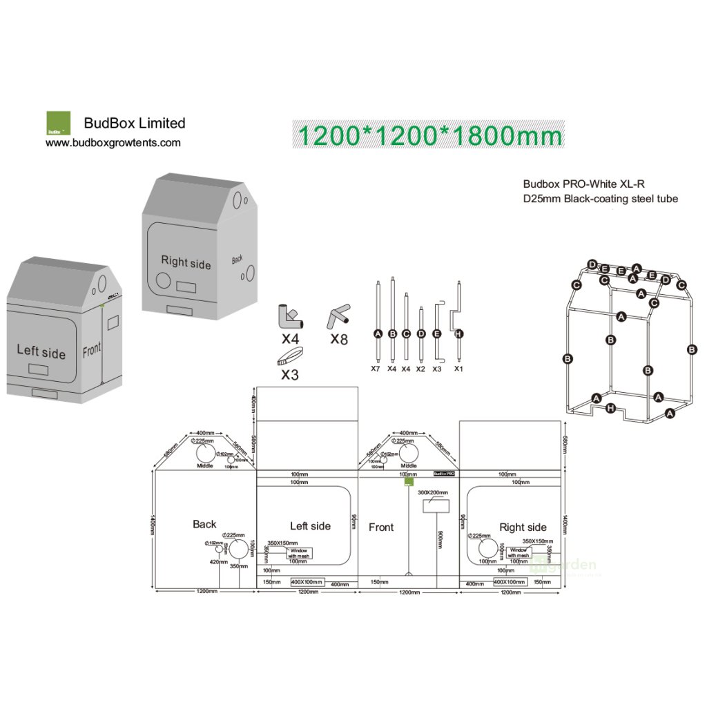 Budbox PRO XL-R ist für HPS- und LED-Beleuchtung ausgelegt. Er besteht aus 100 % porenfreiem, 4-lagigem Material, das ungiftig ist, und einer Metallkonstruktion mit hochwertiger Verarbeitung. die BudBox-Zelte sind jetzt mit Push- und Click-Fit-Verbindungen aus Stahl ausgestattet, die für zusätzliche Stabilität bei all Ihren Anforderungen in Bezug auf Filter, Ventilatoren und Beleuchtung sorgen, sowie mit stärkeren, gehärteten Stahlstangen. Das neue PRO-Modell zeichnet sich durch Verbesserungen wie neue patentierte undurchsichtige Reißverschlüsse, Metallkupplungen und einen unteren Rahmen aus, der speziell für die Entwässerung von Bewässerungsanlagen entwickelt wurde. Außerdem ist das Zelt ohne untere Querrohre und hat einen flachen Boden. Seine Luftkanäle sind jetzt breiter (es können Sono-Kanäle verwendet werden). Das Zelt ist mit einem einzigartigen Sichtfenster aus grüner Folie ausgestattet, durch das Sie die Pflanzen auch dann beobachten können, wenn sie schlafen. Der untere Rahmen ist speziell für das Abflussrohr erhöht.