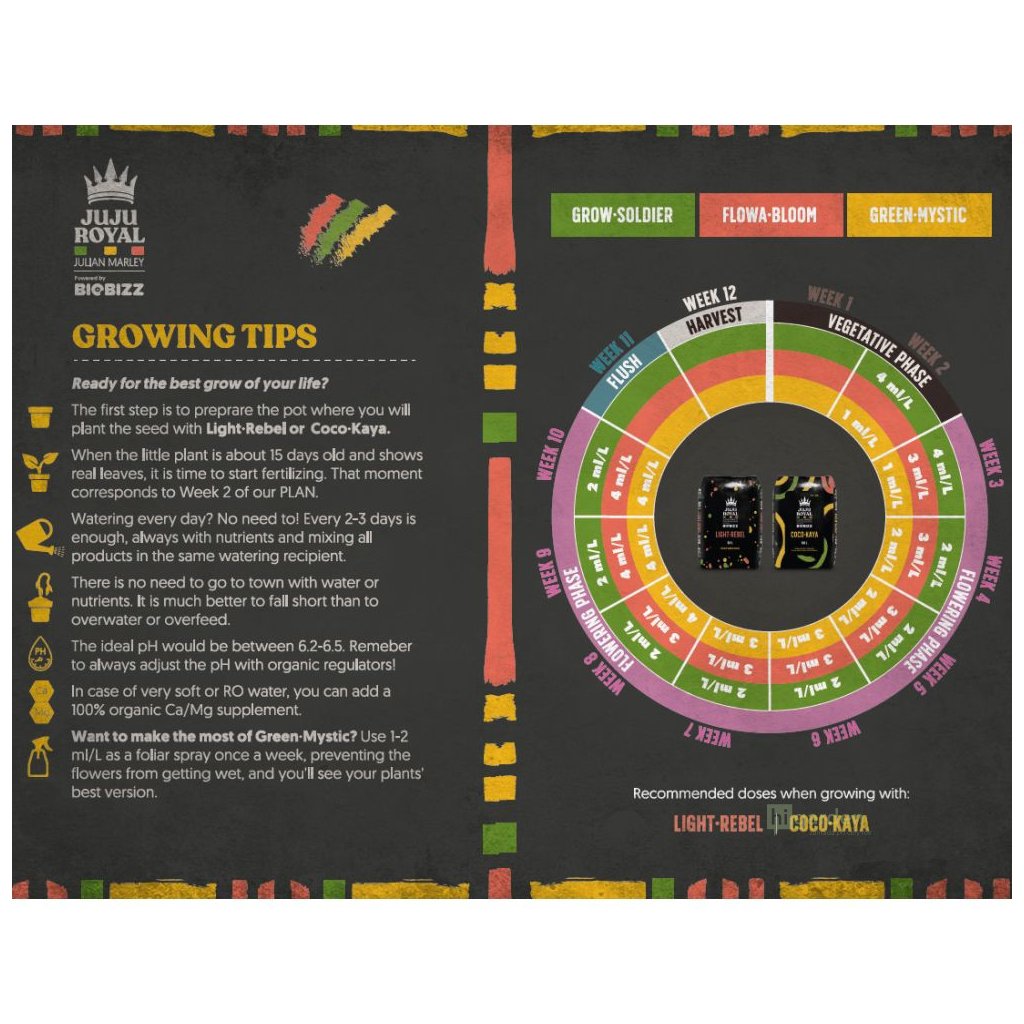 Mit der Produktlinie Juju Royal (unter der Schirmherrschaft von Julian Marley) hat Biobizz seine Produkte mit jamaikanischer Energie und Rastafari-Philosophie durchdrungen. Wie alles von Biobizz basieren auch Juju dünger und Substrate auf jahrelanger Erfahrung und Leidenschaft für gesunde Natur.