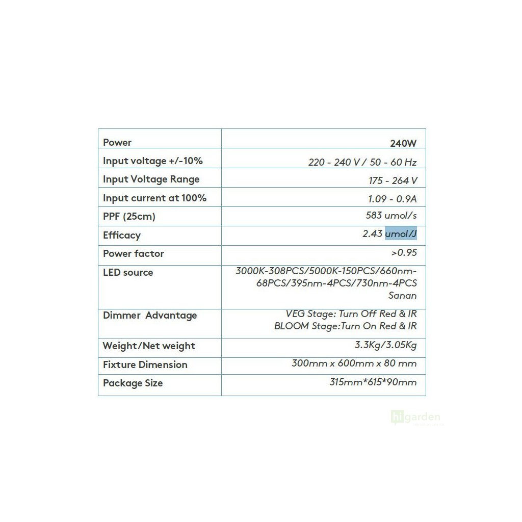 - volles Spektrum mit weißem, blauem, rotem, infrarotem und fernrotem Licht (3000K, 5000K, 395nm, 660nm und 730nm)