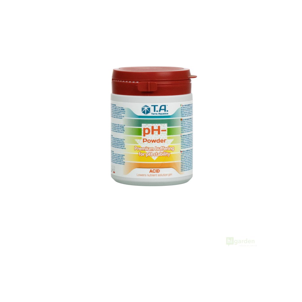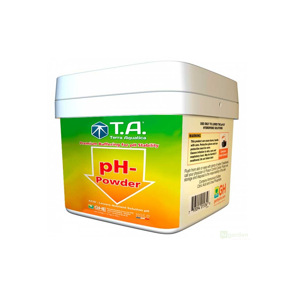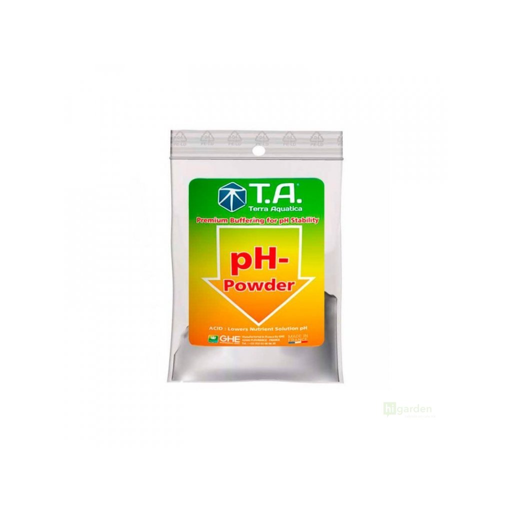 T.A. pH-Pulver, trocken pH (G.H.E. pH Down dry) ist rein, konzentriert und unschädlich. Die Kontrolle des pH-Werts ist für Pflanzenzüchter eine notwendige Praxis. Es ermöglicht die Verfügbarkeit von Mineralsalzen und die Stabilität von Chelaten, zwei Grundvoraussetzungen für eine gute Nährstoffaufnahme der Pflanze.