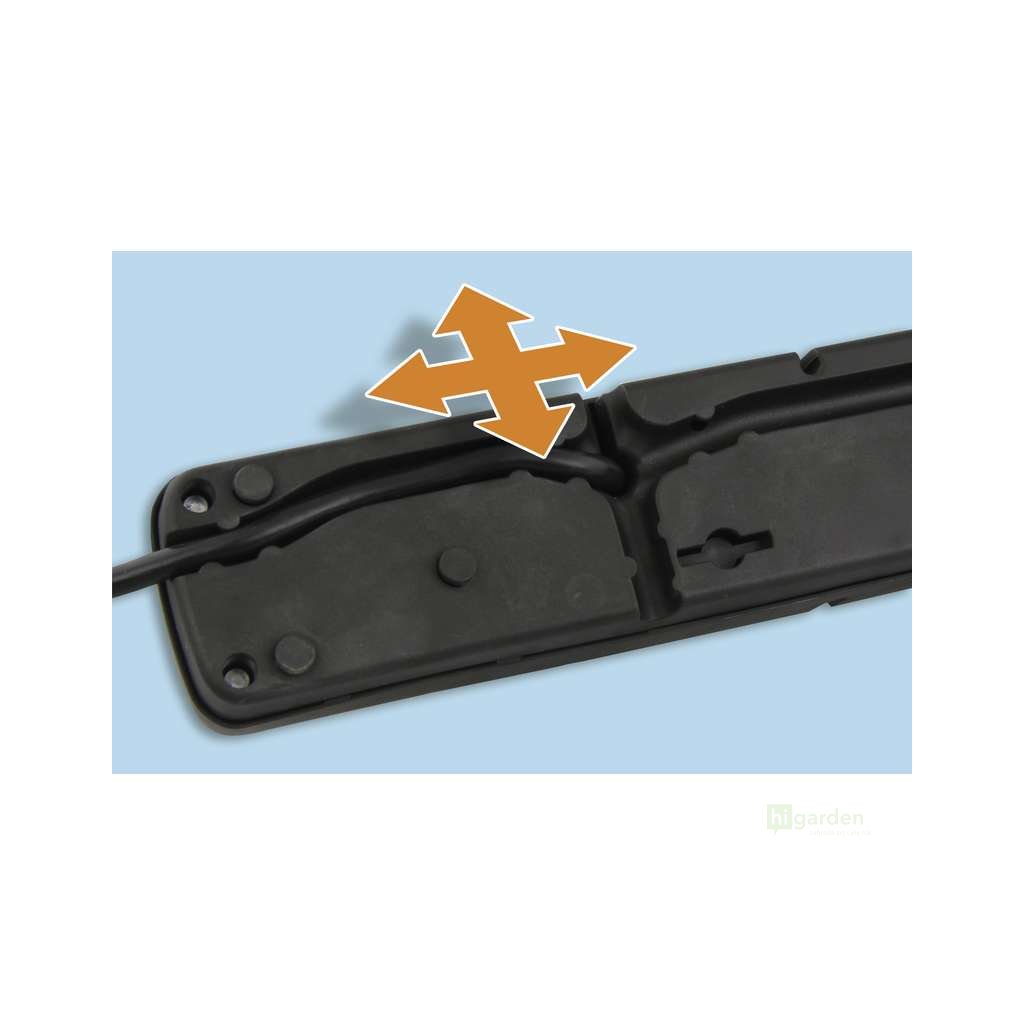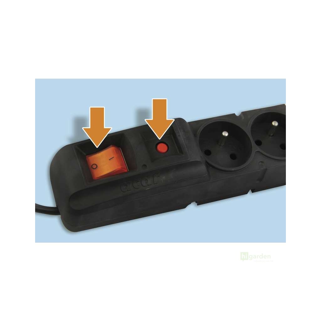Beleuchteter Netzschalter, automatische Sicherung mit Zeitverzögerung. 4 mögliche Richtungen der Netzkabelanordnung.