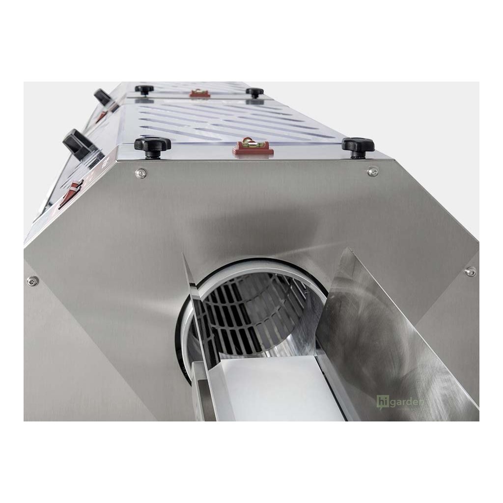 der Master Trimmer MT Tumbler 500 ist mit modernster Technik ausgestattet und für den Trocken- und Nassschnitt mit hervorragender Schnittqualität konzipiert. Die Trommel des Walzenladers besteht aus rostfreiem Stahl 304 und 11 Messern, die verhindern, dass sich die Trockenmasse ansammelt und mitreißt, wodurch die Qualität erhalten bleibt. Die Klingen sind aus gehärtetem Stahl mit einer Antihaftbeschichtung, und die 11-Klingen-Haspel kann 320 Schnitte pro Sekunde ausführen. Auf diese Weise können Sie die Qualität des Handschnitts erreichen und die von den anspruchsvollsten Landwirten erwartete hervorragende Behandlung der Trockenmasse gewährleisten.