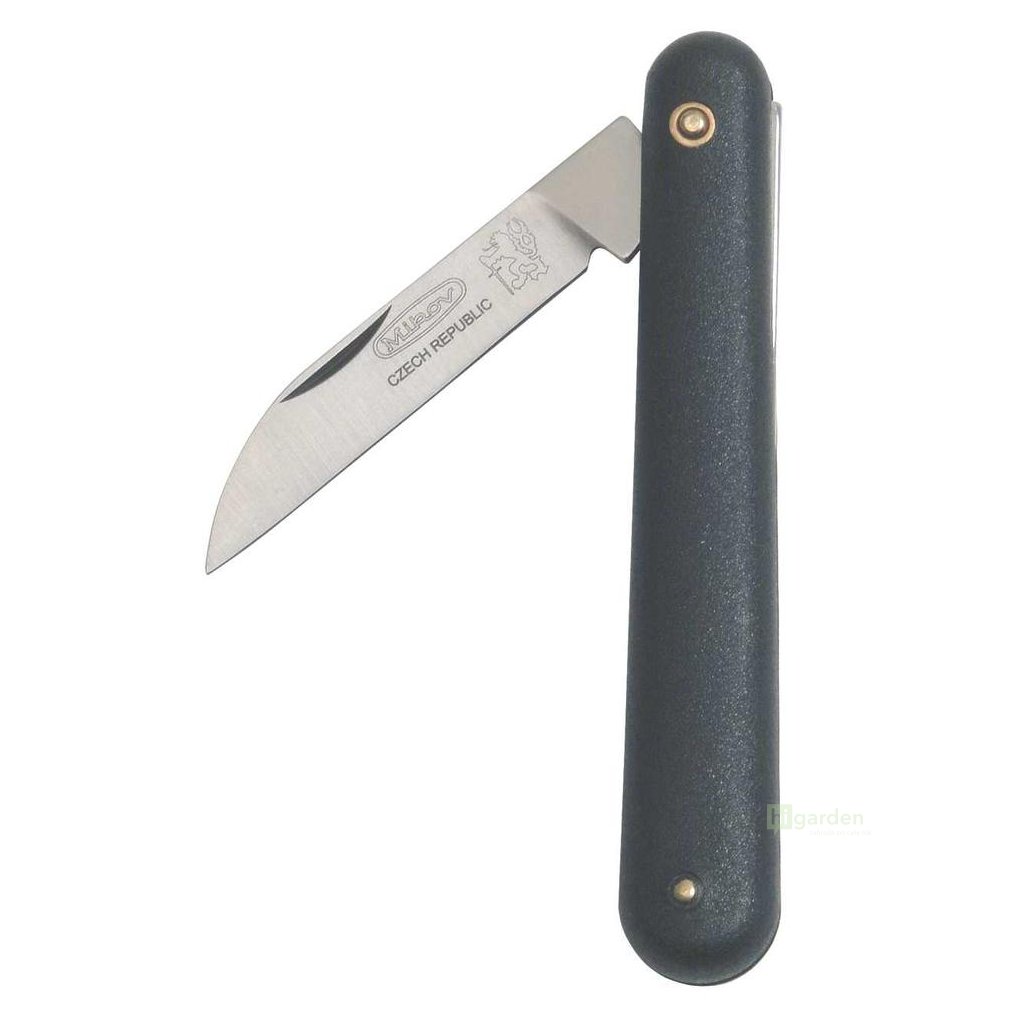 - hat eine einseitig geschliffene Klinge und eine abgestumpfte Spitze (zum Spalten der Rinde beim Impfen)