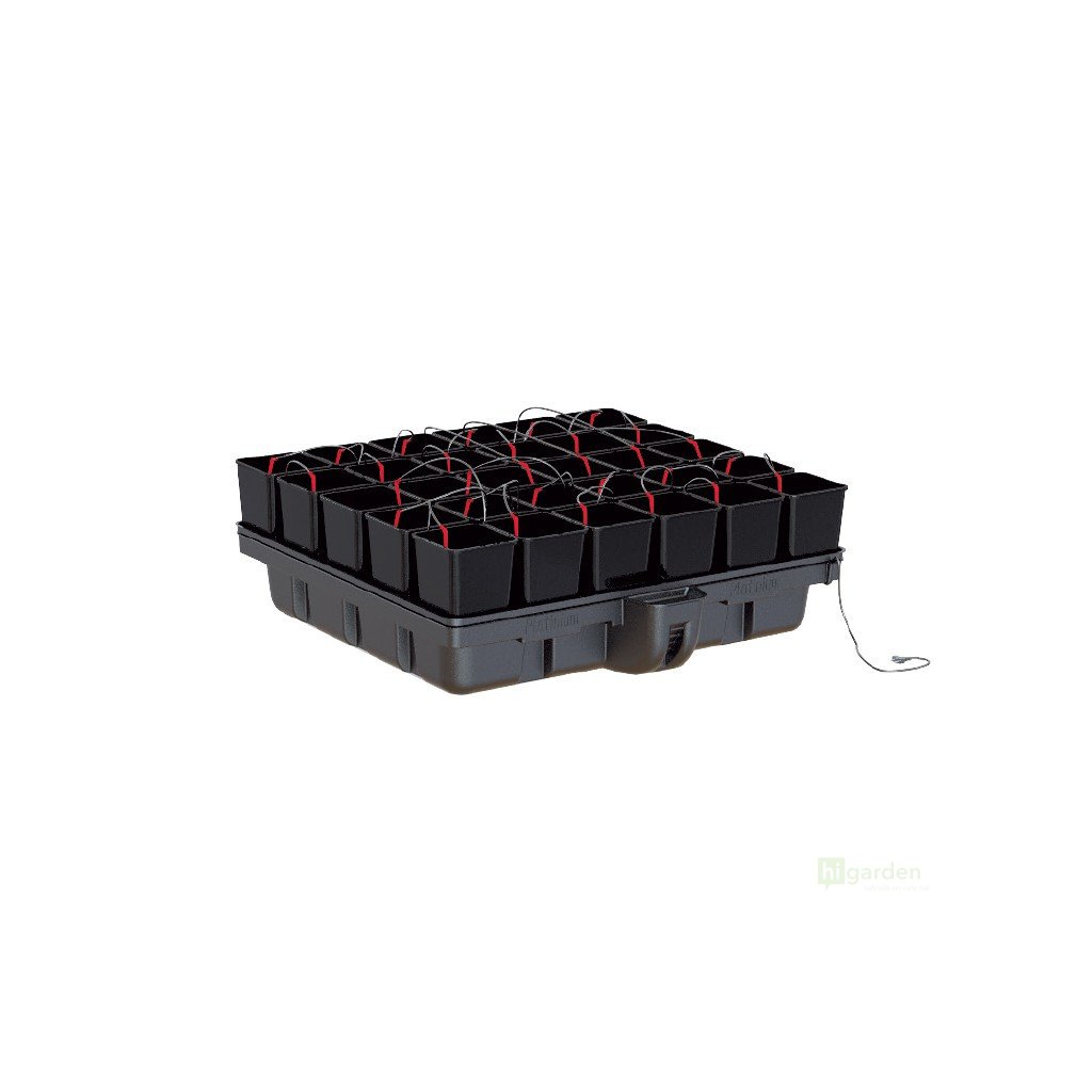 Hydroponische System beliebt für seine günstigen Preis und Zuverlässigkeit. Größe: 120x120x39cm. Der Tank kann maximal 110 l Lösung fassen. Die Pumpe hat eine maximale Förderleistung von 1000 l/h. Dieses Set enthält auch 30x6l Töpfe (18x18x23cm).