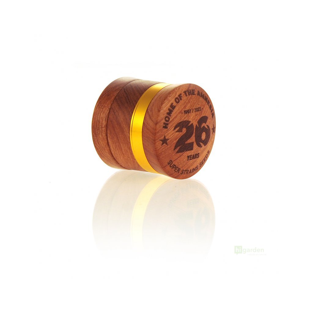 Vierteiliger Rosenholz-Shredder Super Puff zum 26-jährigen Jubiläum von Super Strains! Durchmesser 60 mm - limitierte Sammlerausgabe.