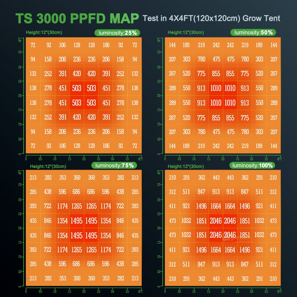 Die TS3000 zeichnet sich durch einen geringen Stromverbrauch von nur 450 W und 1210 umol/s aus und spart im Vergleich zu herkömmlichen HPS/MH-Lampen bis zu 40 % Strom. Die Beleuchtung hat eine einzigartige reflektierende Aluminiumoberfläche mit hochreflektierendem Material und einem Brechungswinkel von 120°. Sie kann einen größeren Bereich von Reflektoren abdecken, um die Lichtintensität zu erhöhen und das gestreute Licht effizient zu den Pflanzen zurück zu reflektieren. Dadurch wird die Lichtausnutzung um 25 % erhöht, so dass die Pflanzen mehr Energie erhalten, ohne vom Licht verbrannt zu werden, und eine maximale Lichtausbeute erzielen.