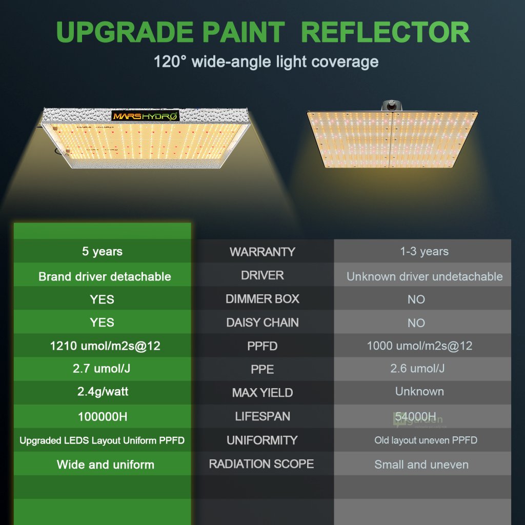 Mars Hydro TS3000 ist eine LED-Leuchte mit einem Lichtbrechungswinkel von 90° bis 120° und einem verbesserten weißen Reflektor, der es Ihren Pflanzen ermöglicht, mehr Energie aus dem Licht aufzunehmen. Diese Art von Beleuchtung ist für eine Anbaufläche von 120x120 cm geeignet.