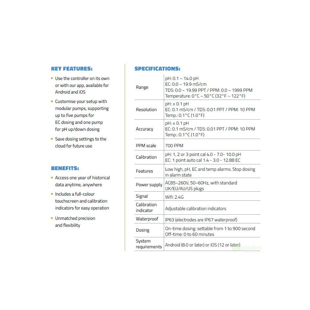 - Das fortschrittliche Überwachungssystem überwacht kontinuierlich pH-Wert, EC-Wert und Temperatur, um die ideale Umgebung für das Wachstum Ihrer Pflanzen zu gewährleisten