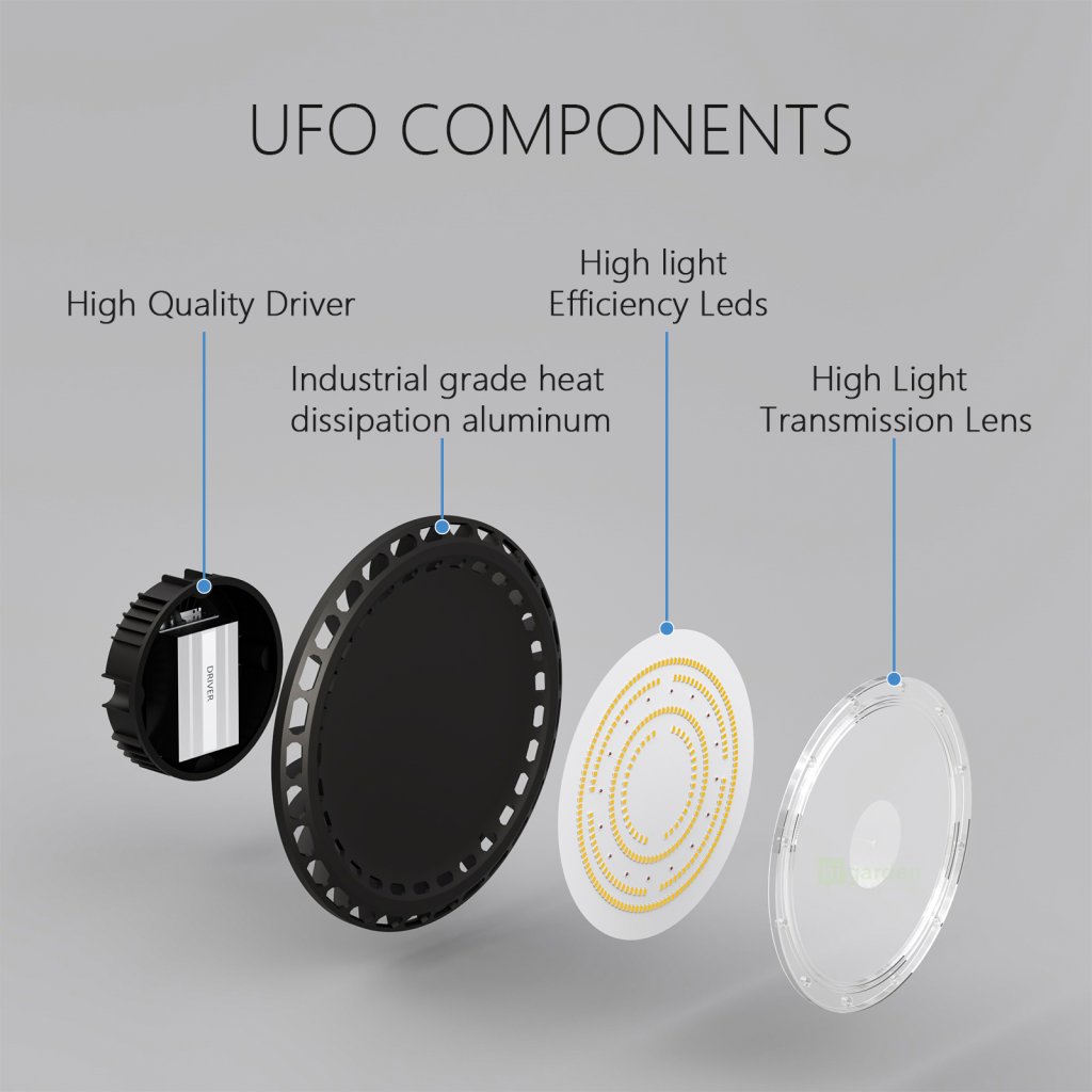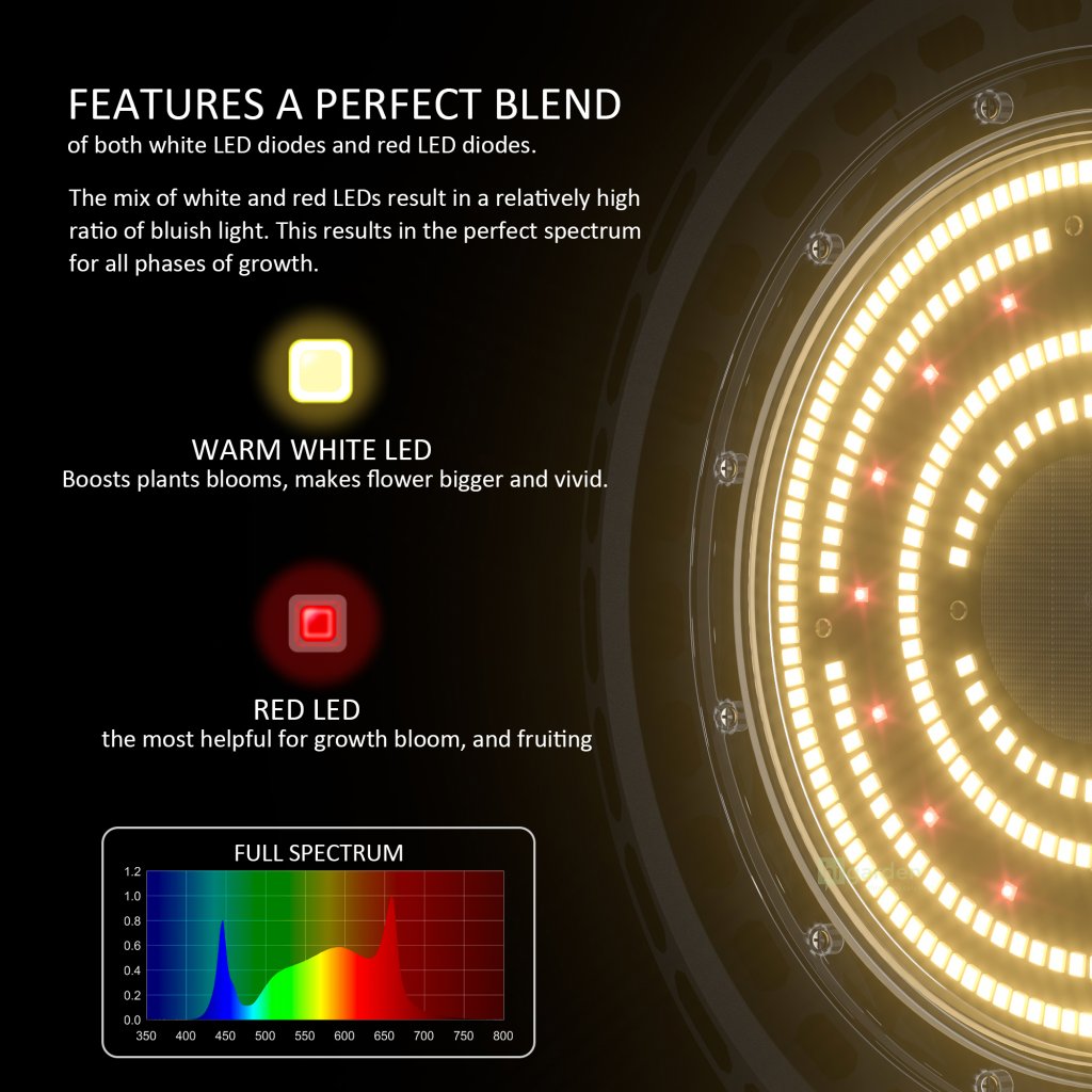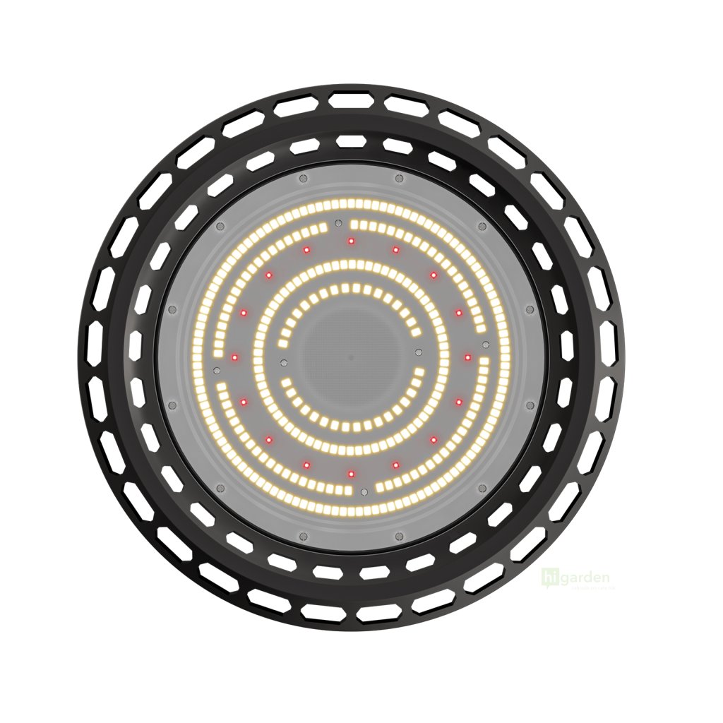 Die VF UFO 150W 2,2 umol/J ist eine hochmoderne LED-Beleuchtungslösung, die auf modernen SMD-LEDs (entspricht Samsung 301H) und einem hochwertigen Treiber in einem bewährten, wasserdichten und robusten Industriegehäuse basiert.
