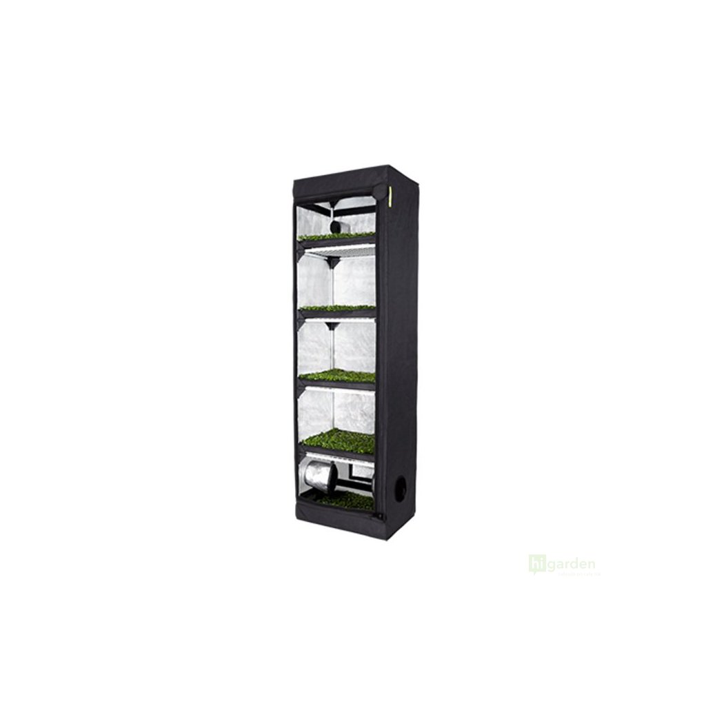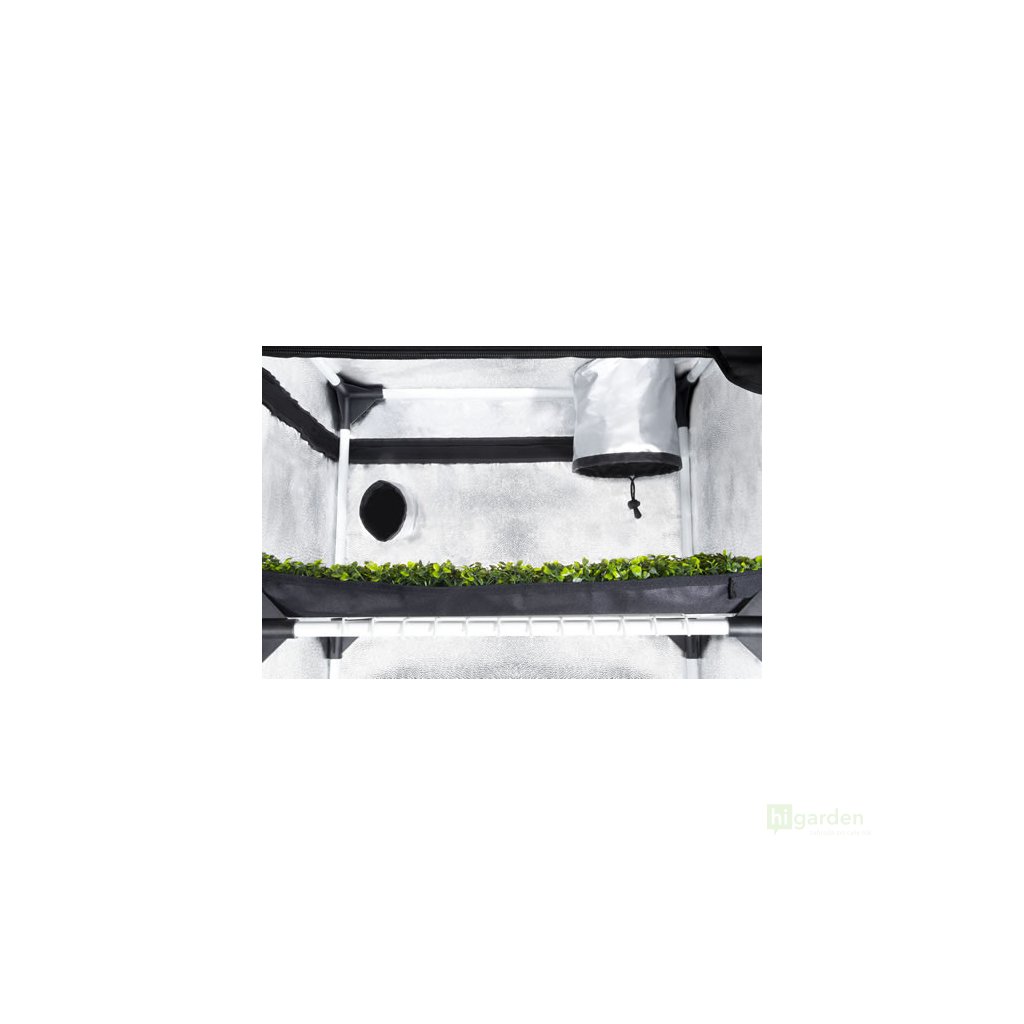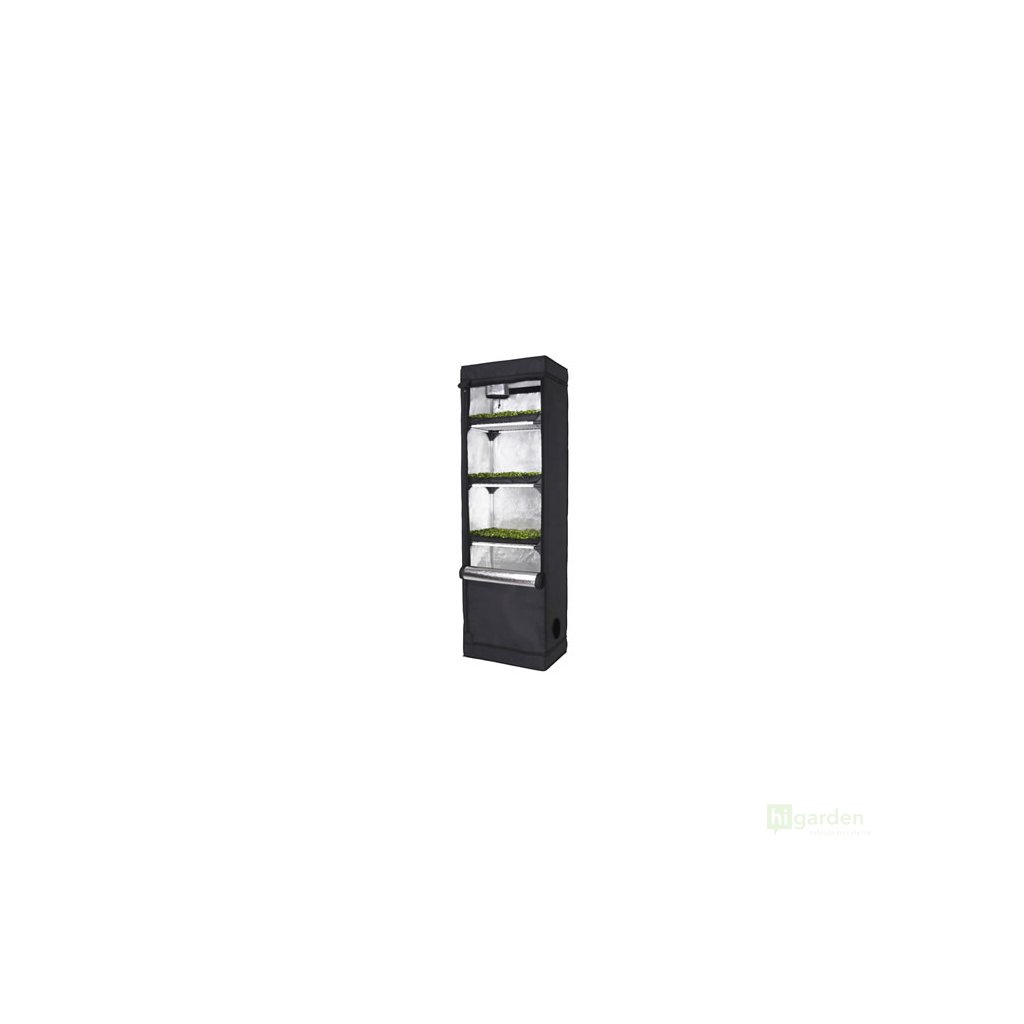 Probox Propagator L hat 5 Etagen in 2 Metern Höhe. Es ist mit einer stabilen Konstruktion ausgestattet. Die Außenhülle besteht aus strapazierfähigem und starkem Nylon 420D. Die reflektierende Mylar-Innenfolie bietet einen Reflexionsgrad von bis zu 97 %. Der gesamte Projektträger ist in geschlossenem Zustand undurchsichtig. Reißverschlüsse sorgen dafür, dass das Zelt absolut lichtdicht ist. Die Vordertür ermöglicht den Zugang zur Inspektion.