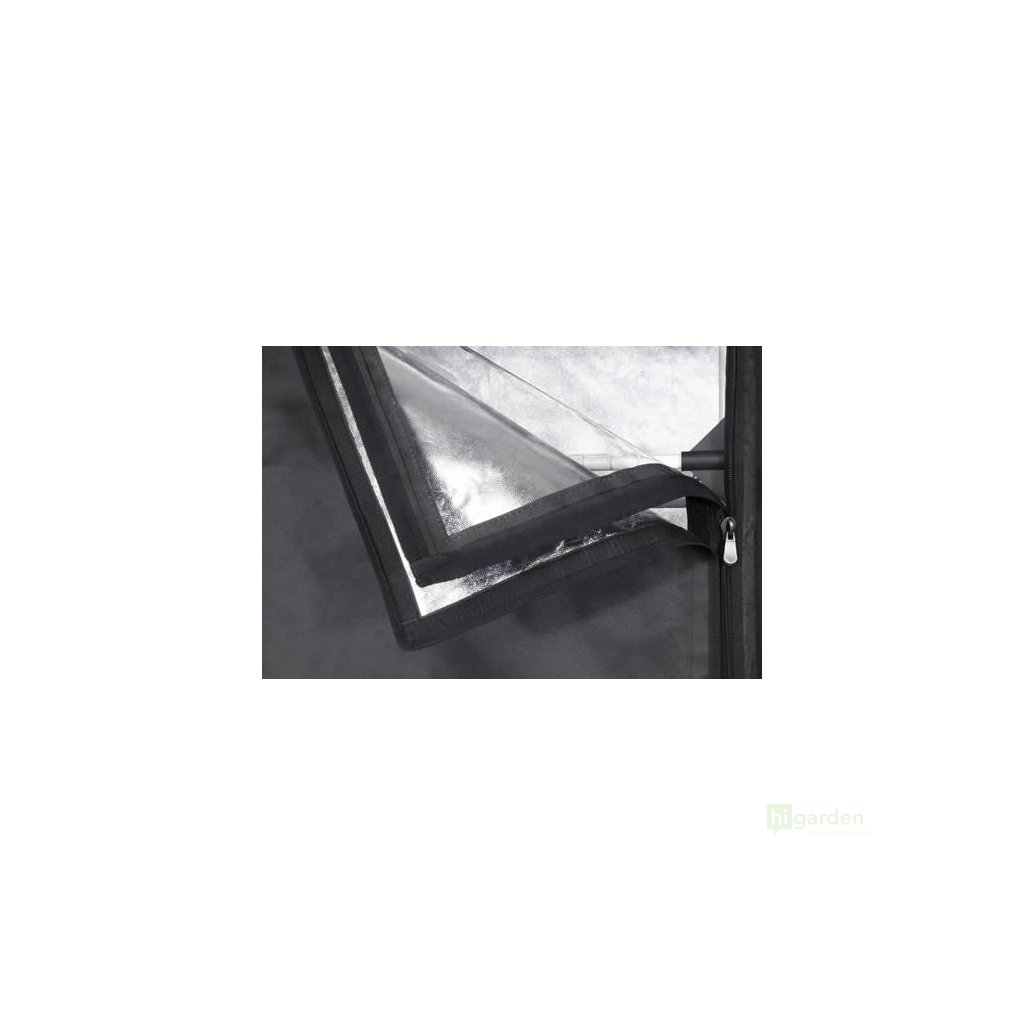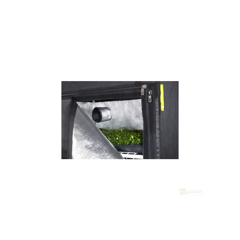 Natürlich gibt es drei Löcher für das Lüftungssystem (Durchmesser 135 mm) und vier Löcher für Kabel. Das für dieses Zelt verwendete Material gefährdet weder die Pflanzen noch Ihre Gesundheit. Das patentierte Design garantiert perfekte Stabilität und korrekte Form unter Vakuum.