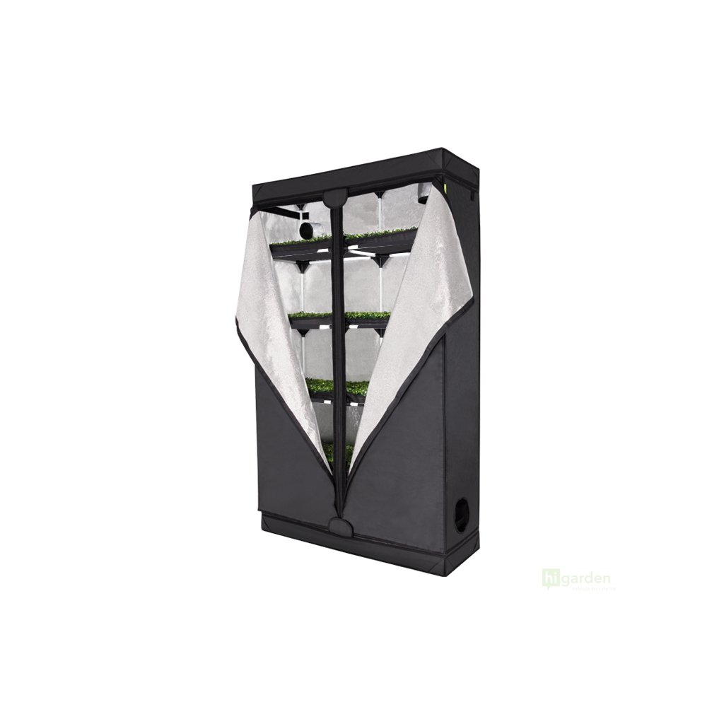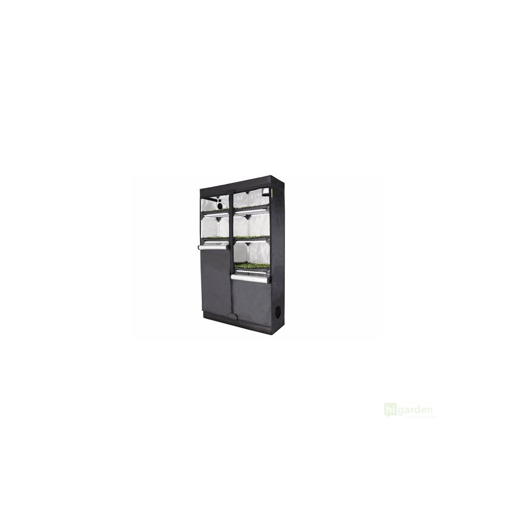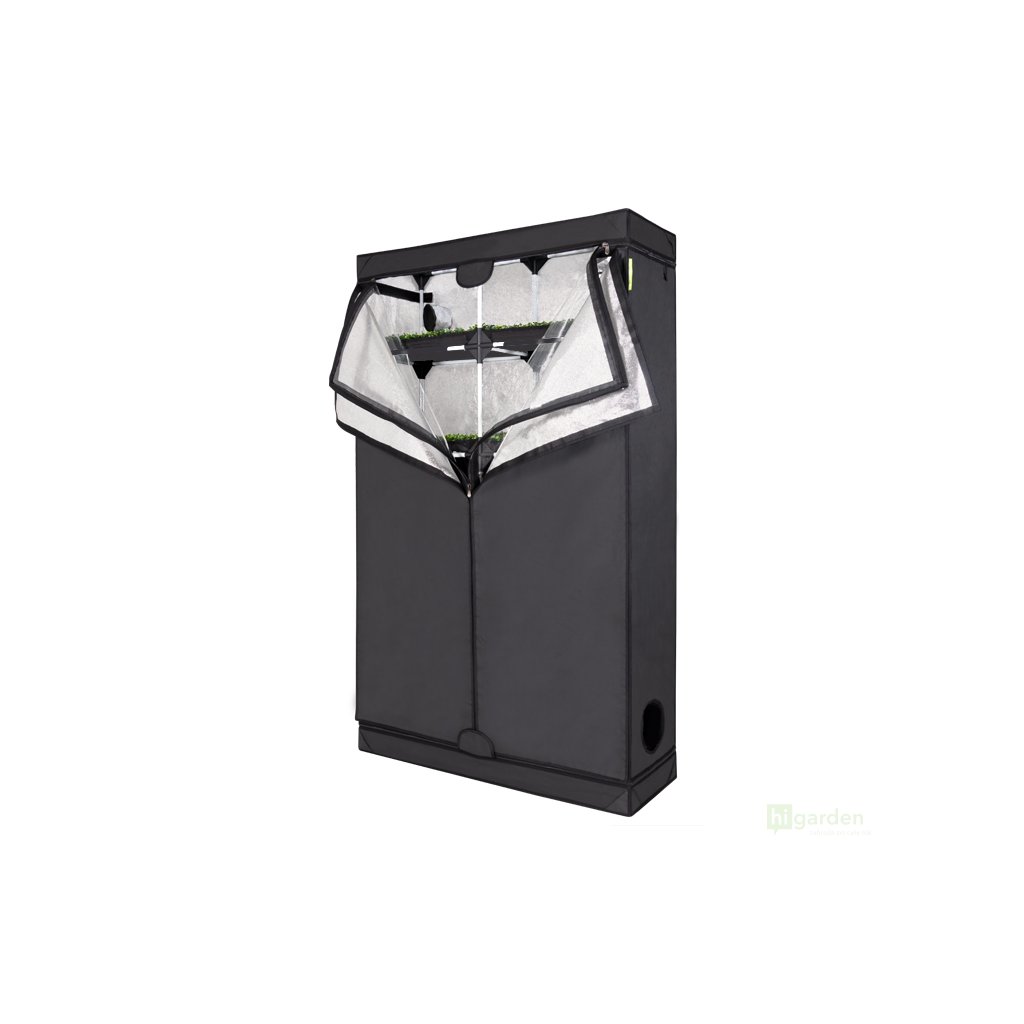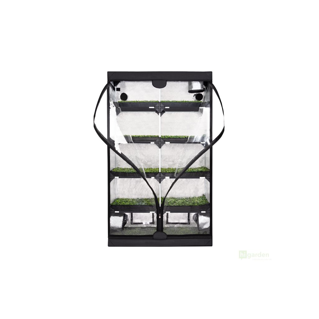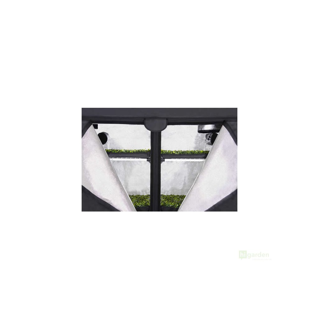 Der Probox Propagator XL hat 5 Etagen in einer Höhe von 2 Metern. Es ist mit einer stabilen Konstruktion ausgestattet. Die Außenhülle besteht aus strapazierfähigem und starkem Nylon 420D. Die reflektierende Mylar-Innenfolie bietet einen Reflexionsgrad von bis zu 97 %. Der gesamte Projektträger ist in geschlossenem Zustand undurchsichtig. Reißverschlüsse sorgen dafür, dass das Zelt absolut lichtdicht ist. Die Vordertür ermöglicht den Zugang zur Inspektion.