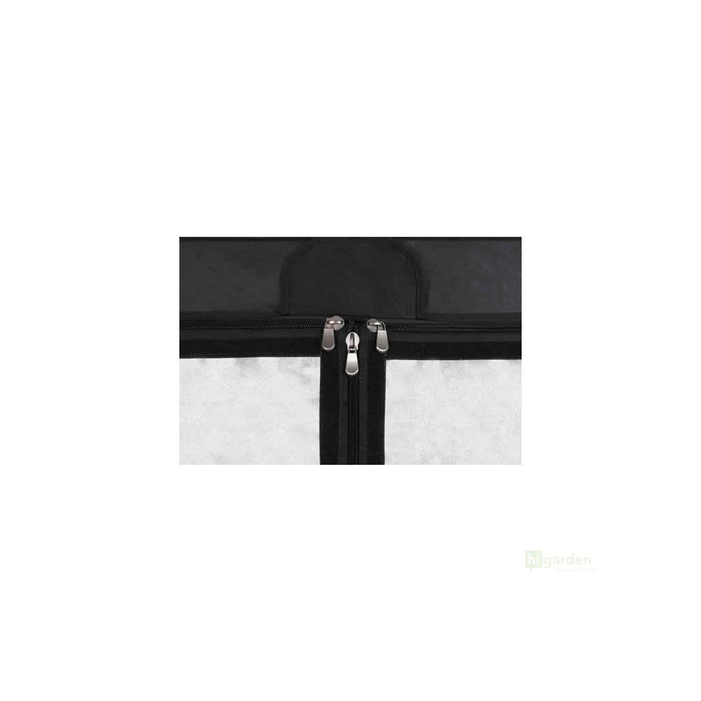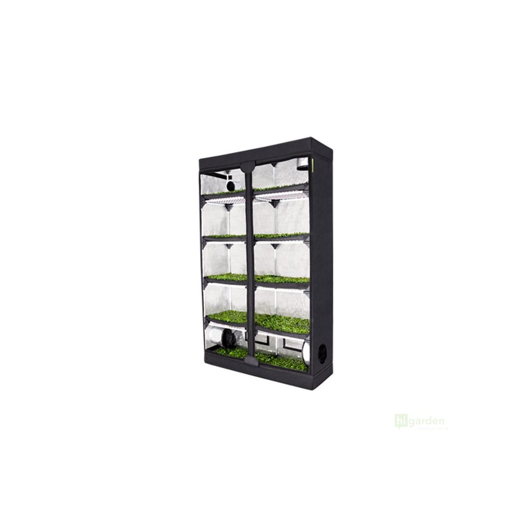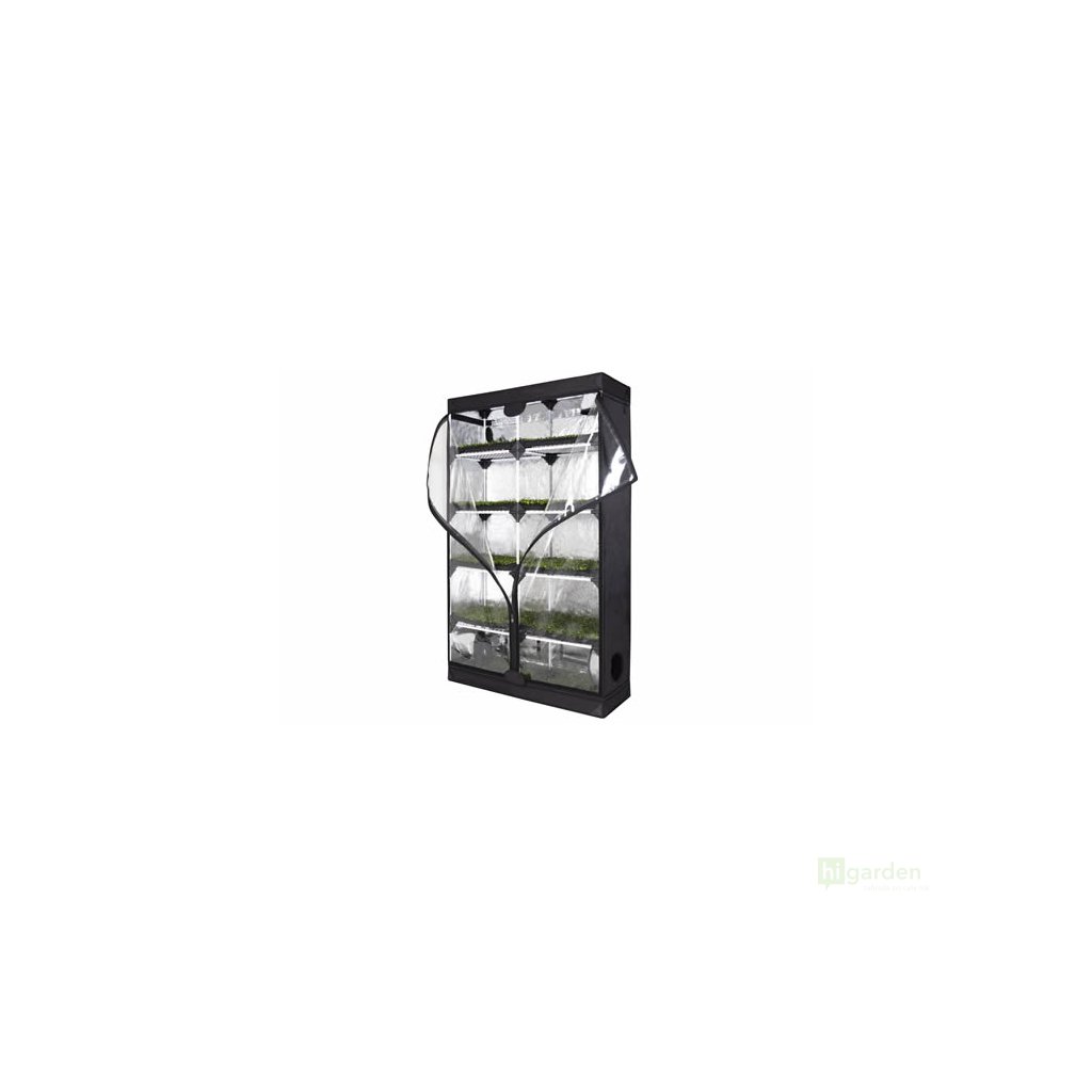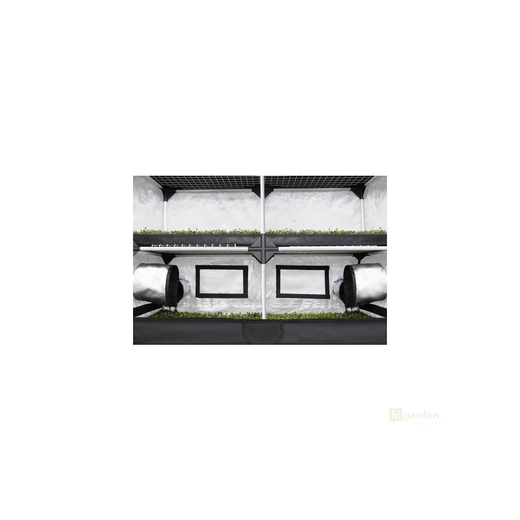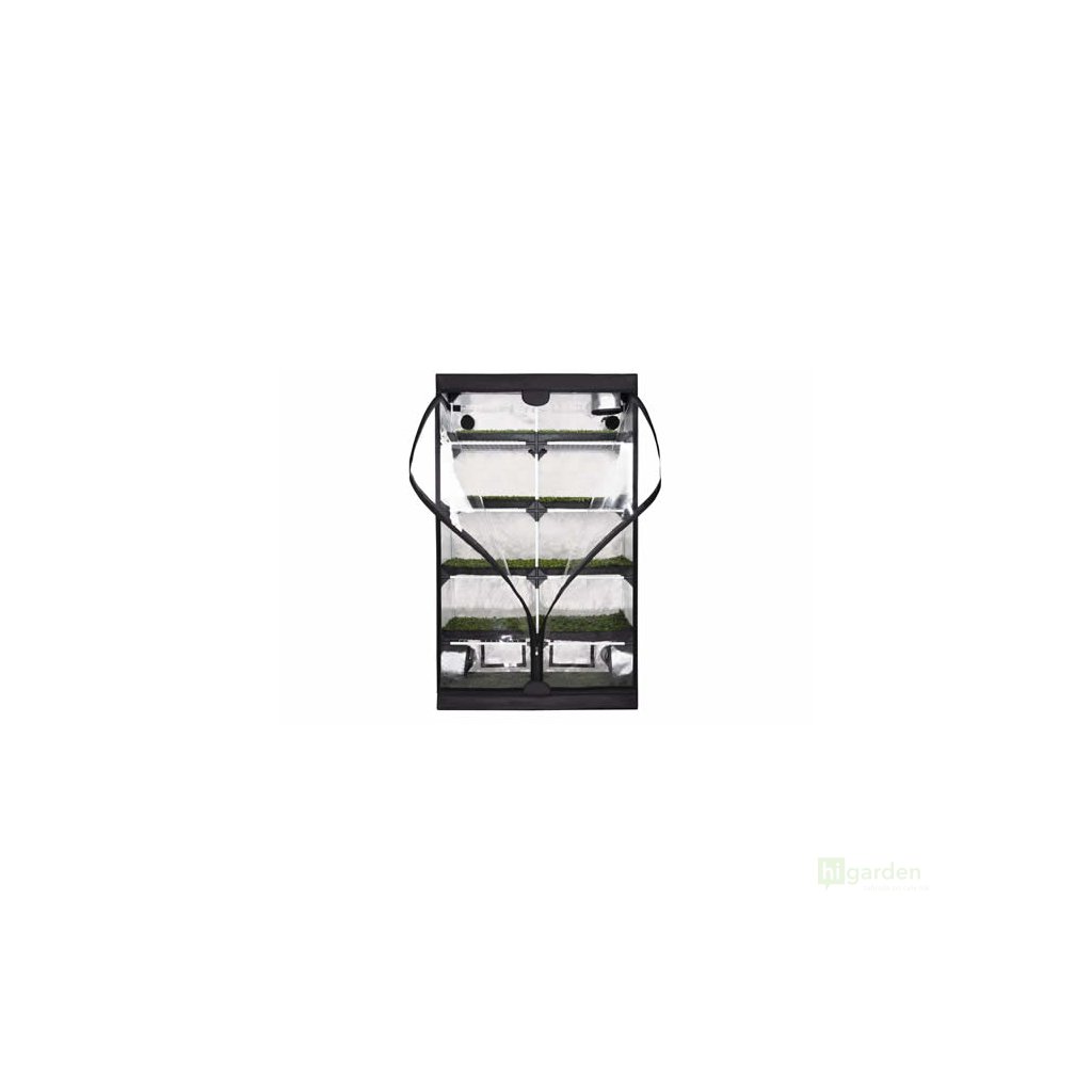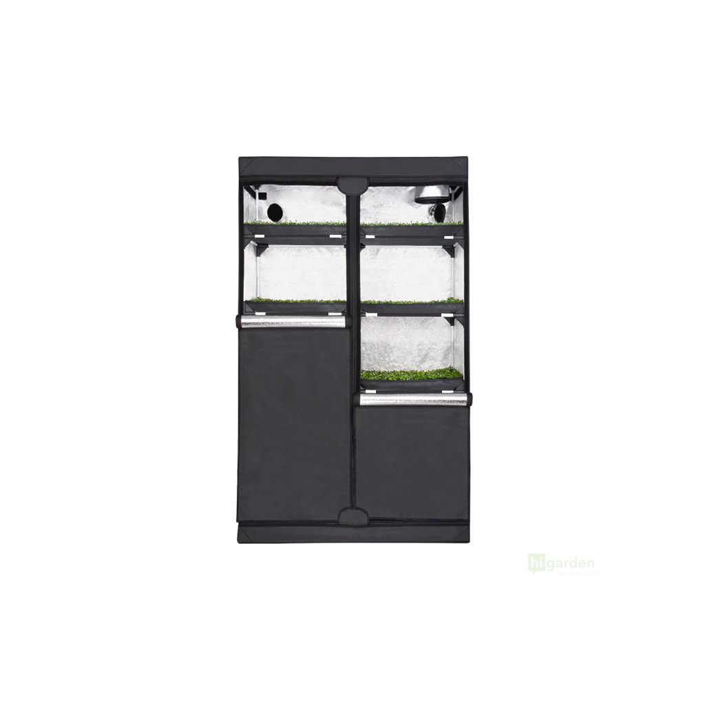 Der Probox Propagator XL hat 5 Etagen in einer Höhe von 2 Metern. Es ist mit einer stabilen Konstruktion ausgestattet. Die Außenhülle besteht aus strapazierfähigem und starkem Nylon 420D. Die reflektierende Mylar-Innenfolie bietet einen Reflexionsgrad von bis zu 97 %. Der gesamte Projektträger ist in geschlossenem Zustand undurchsichtig. Reißverschlüsse sorgen dafür, dass das Zelt absolut lichtdicht ist. Die Vordertür ermöglicht den Zugang zur Inspektion.
