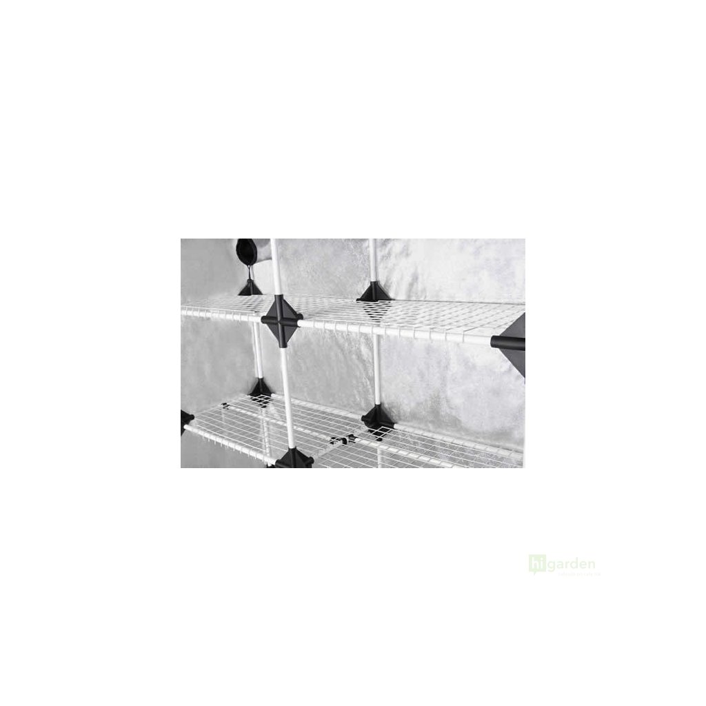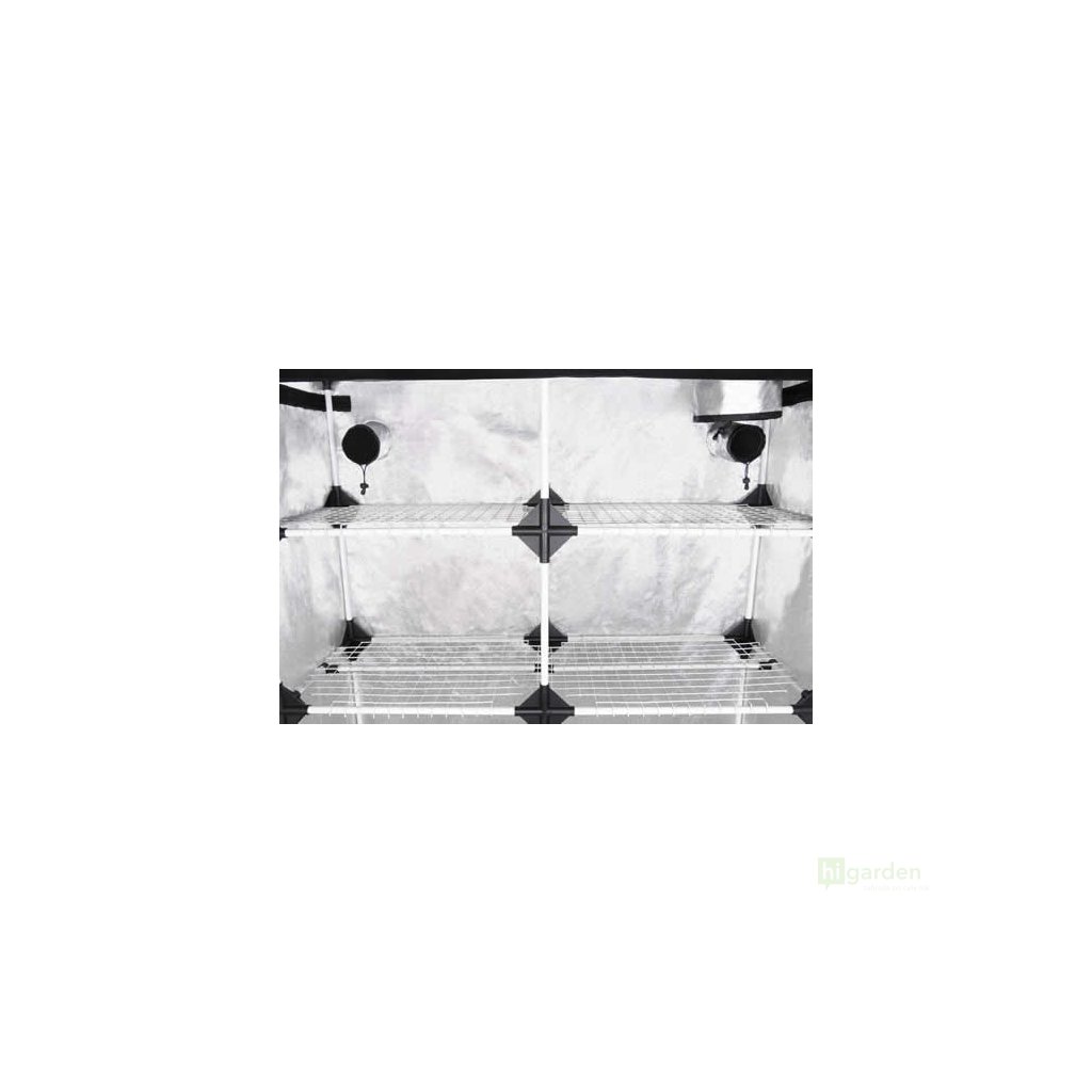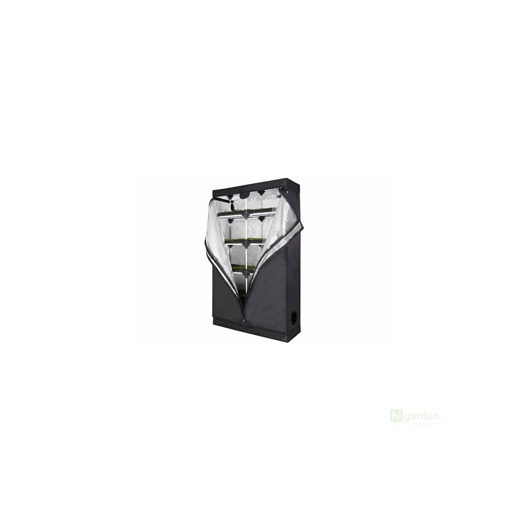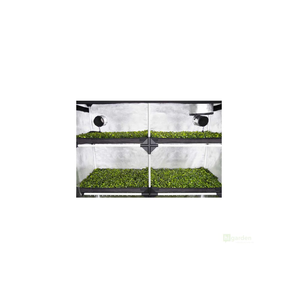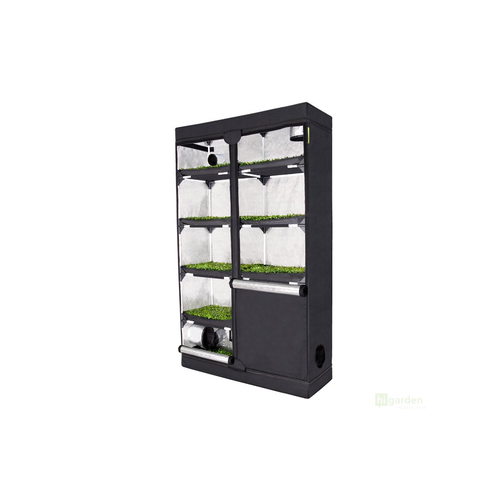 Der Probox Propagator XL hat 5 Etagen in einer Höhe von 2 Metern. Es ist mit einer stabilen Konstruktion ausgestattet. Die Außenhülle besteht aus strapazierfähigem und starkem Nylon 420D. Die reflektierende Mylar-Innenfolie bietet einen Reflexionsgrad von bis zu 97 %. Der gesamte Projektträger ist in geschlossenem Zustand undurchsichtig. Reißverschlüsse sorgen dafür, dass das Zelt absolut lichtdicht ist. Die Vordertür ermöglicht den Zugang zur Inspektion.