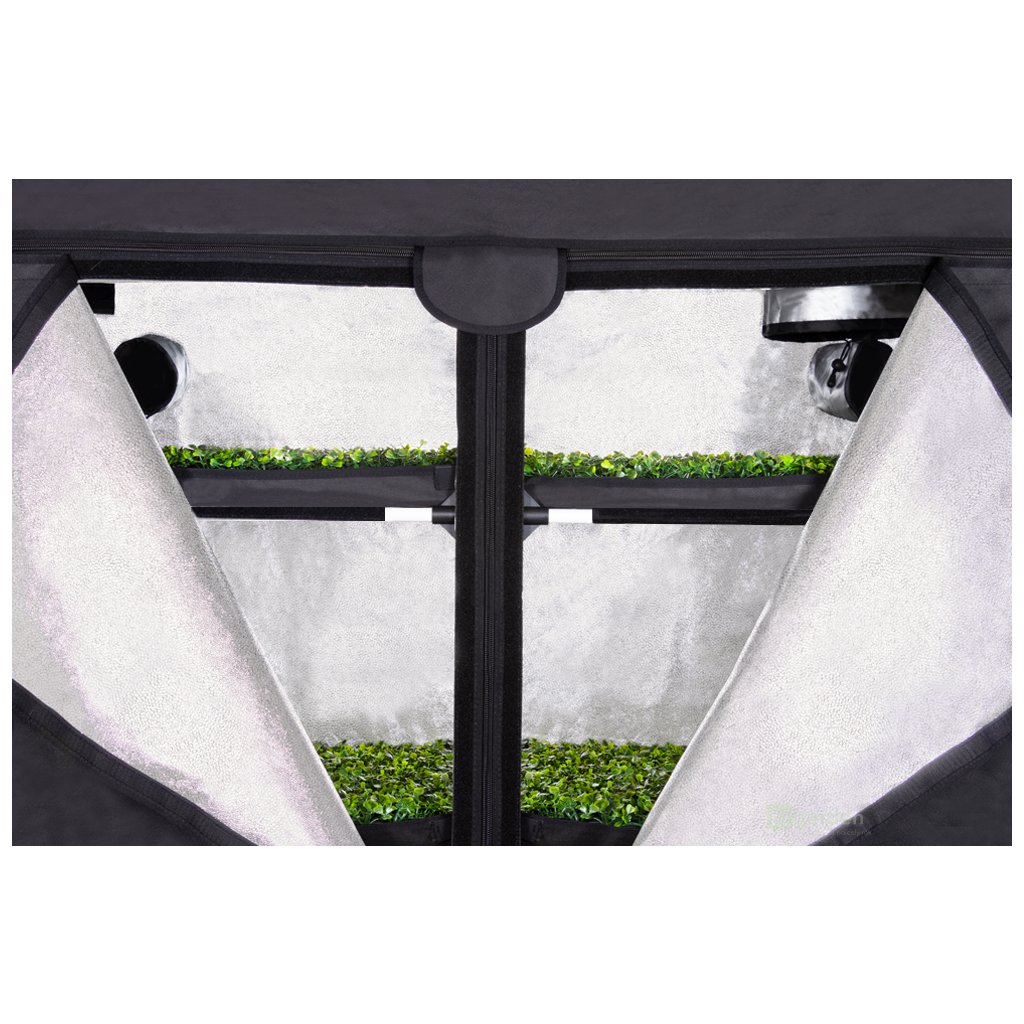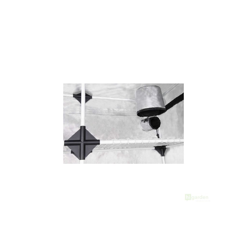 Natürlich gibt es drei Löcher für das Lüftungssystem (Durchmesser 135 mm) und vier Löcher für Kabel. Das für dieses Zelt verwendete Material gefährdet weder die Pflanzen noch Ihre Gesundheit. Das patentierte Design garantiert perfekte Stabilität und korrekte Form unter Vakuum.