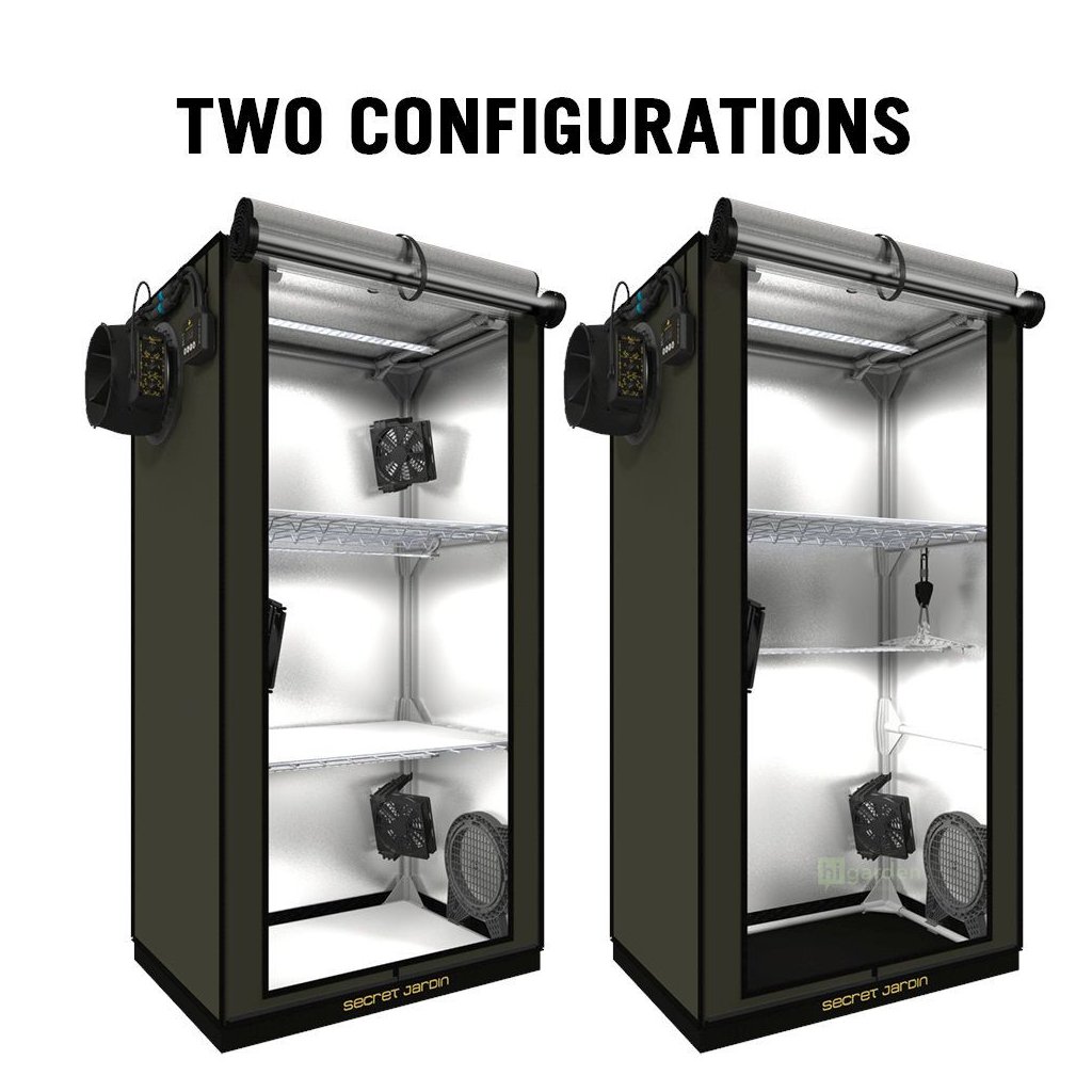 Die mitgelieferten Einlegeböden können entfernt werden, um Platz und Beleuchtung zu kombinieren und so eine höhere Beleuchtungsintensität zu erreichen, die für den Anbau geeignet ist, oder um eine Zwischeneinstellung für Klonen und Anbau auf verschiedenen Ebenen.