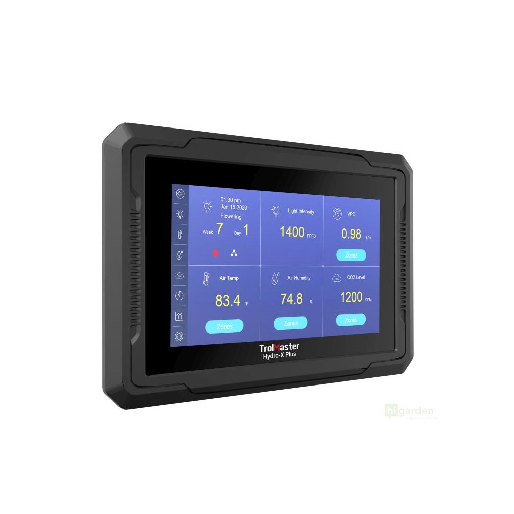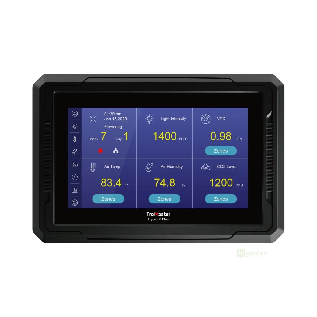 Das Hydro-X Plus / HCS-3 ist ein professionelles Ein-Zonen-Klimaregelungssystem, das den gesamten Anbauraum regeln kann. Es verfügt über ein 7"-LED-Display mit einer Auflösung von 800 × 480 Pixeln und kann eine unbegrenzte Anzahl von Leuchten, 8 Temperatur-, 8 Feuchtigkeits- und 4 CO2-Kontrollgeräten sowie 12 programmierbare Zeitschaltuhren (bis zu 50 Zeitpläne können erstellt werden) steuern. Dank der unglaublichen Flexibilität und der erweiterten Produktkapazität kann nun jeder sein eigenes Grow-Room-Management-System für maximale Erträge leicht anpassen. Durch den Einsatz mehrerer Steuermodule hat der Benutzer außerdem die Möglichkeit, mehrere "Stufen" der Temperatur- und Feuchtigkeitsregelung zu schaffen und so eine stabilere Umgebung zu schaffen.