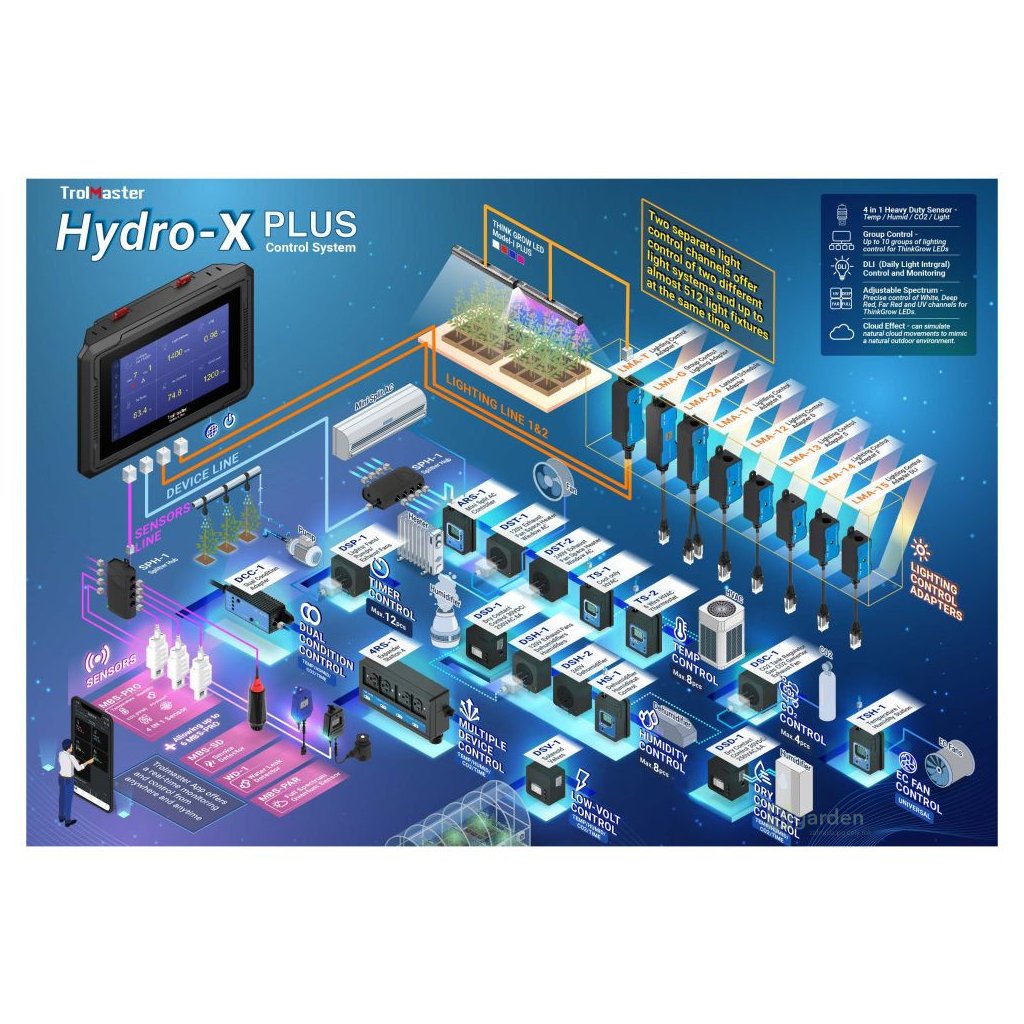 Das HCS-3 ist mit dem MBS-PRO 4-in-1-Sensor ausgestattet, der Temperatur, Luftfeuchtigkeit, ppm CO2 und die Anwesenheit von Licht misst. Die Beleuchtungssteuerung war noch nie so einfach und leistungsfähig. Das System kann mit dem optionalen Lichtsensor MBS-PAR ergänzt werden. Sie passt die Lichtintensität automatisch an, um genau die richtige Lichtmenge für ein optimales Pflanzenwachstum bereitzustellen. Das Hydro-X Plus-System war auch in der Lage, die DLI zu überwachen. Mit 2 separaten Beleuchtungssteuerungskanälen kann der Benutzer mehrere Beleuchtungslayouts (und Dimmsequenzen) erstellen, die seinen individuellen Vorlieben entsprechen.