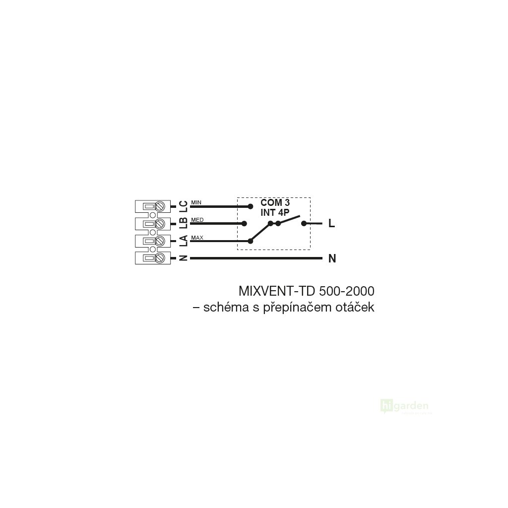 Die Motoren der Ventilatoren TD- 500 bis TD-2000 haben drei Wicklungen. Bei Motoren mit drei Wicklungen (TD 500 - TD 2000) wird die Drehzahl in drei Stufen mit den Reglern COM 3 oder INT 4P geschaltet oder es kann eine Spannungsänderungsregelung mit REB (stetige Regelung) oder REV (fünfstufige Regelung) verwendet werden. Die Klemmenleiste befindet sich am Ventilatorgehäuse.